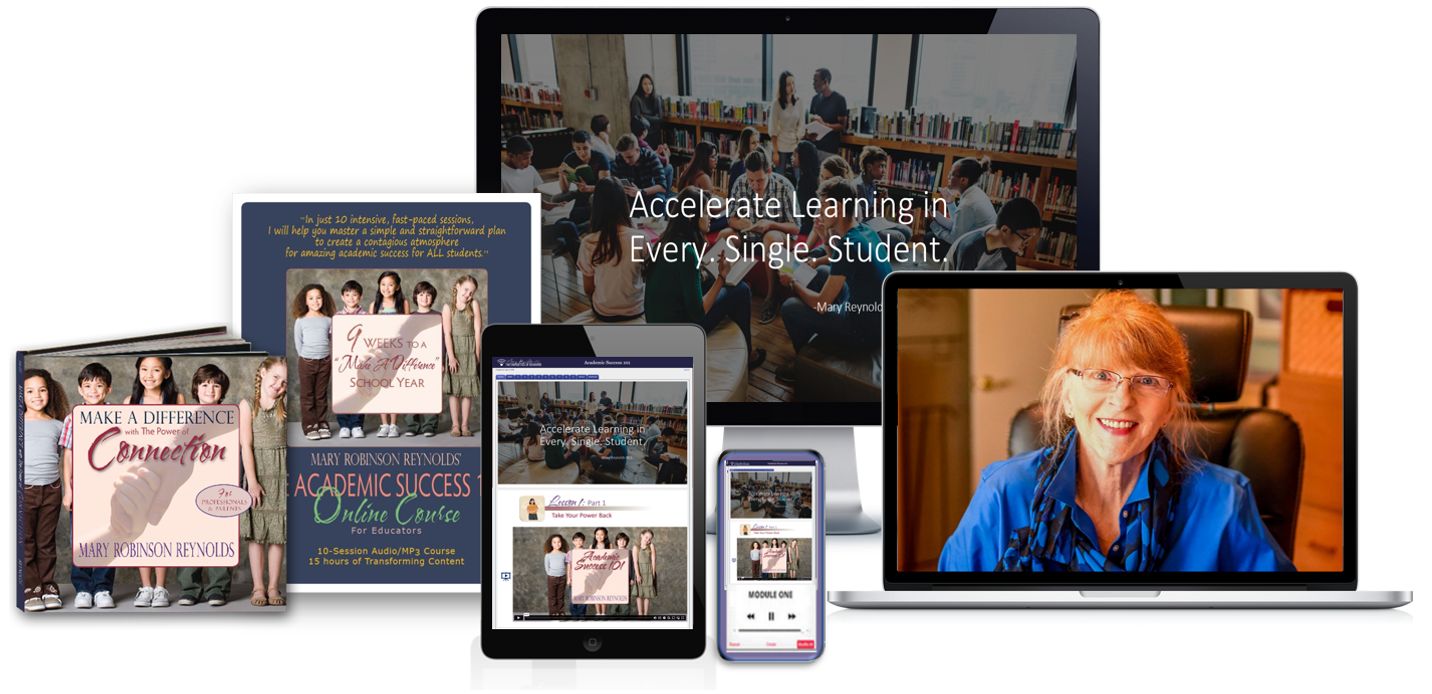 In her 9-week mastery training, Mary works with 8-10 faculty and staff (core team leaders) via WebinarJam to help your core team become proficient in the two key facets of Academic Success 101: Accelerated Learning (MAPit: 30 Second TurnAround and the 9-Week Curriculum for building MindSafe Communities). The training requires that participants submit work samples to Mary via email and participate in weekly one-hour group coaching and feedback sessions.